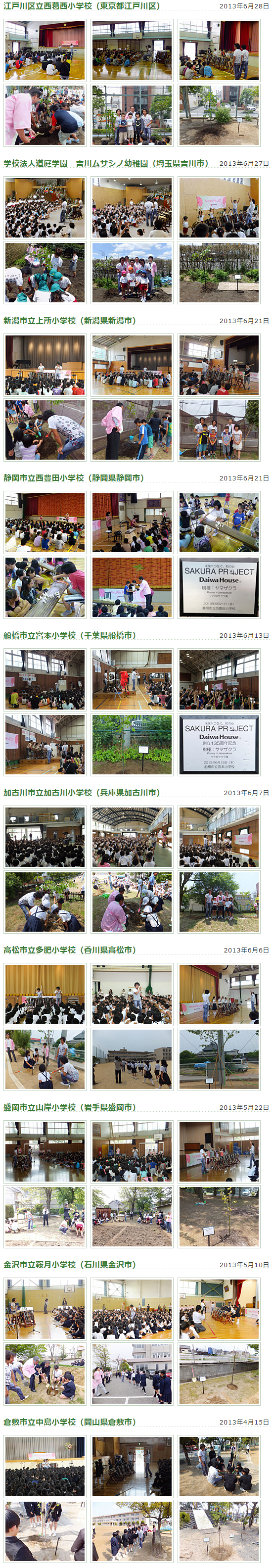 2013年度 植樹の状況 植樹本数 100 本 植樹人数 5,822 人 植樹場所 43 ヶ所 ページトップへ 桜プロジェクト(国内) 2017年度 植樹地一覧 2016年度 植樹地一覧 2015年度 植樹地一覧 2014年度 植樹地一覧 2013年度 植樹地一覧 2012年度 植樹地一覧 2011年度 植樹地一覧 2010年度 植樹地一覧 桜プロジェクト(海外) MINORIプロジェクト 大和ハウス工業の桜保全活動