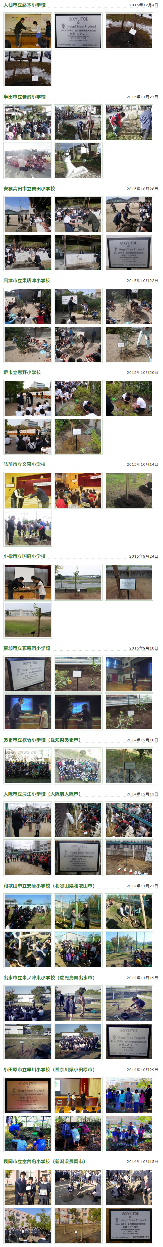■2014・2015年度「楽しく学ぼう!歯の健康講座」×植樹式 植樹地一覧 植樹本数 16 本 植樹人数 1,060 人 植樹場所 15ヶ所 2014、2015年度 ページトップへ 楽しく学ぼう!歯の健康講座 ■ 過去の植樹地一覧 2016年度 2014年・2015年度 2012年・2013年度 2010年・2011年度 2008年・2009年度